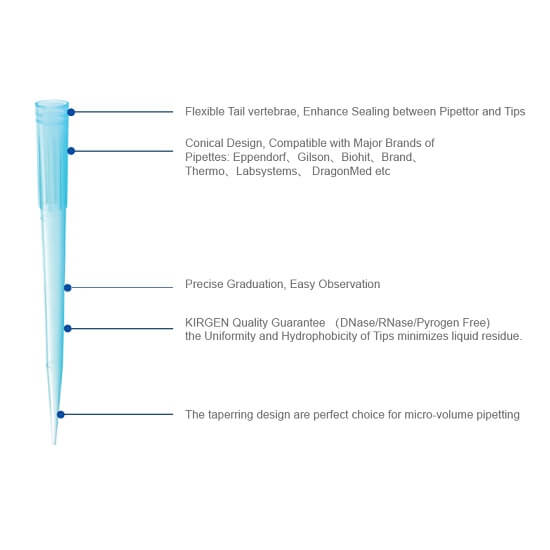 Filtreler yüksek yoğunluklu polietilenden yapılmıştır, yapıştırıcı ve PCR inhibitörü içermez, çapraz kontaminasyonu etkili bir şekilde azaltır ve kullanıcıları korur. Hidrofobik ham maddeler pipetleri kontaminasyondan korur ve numune kaybını önler.