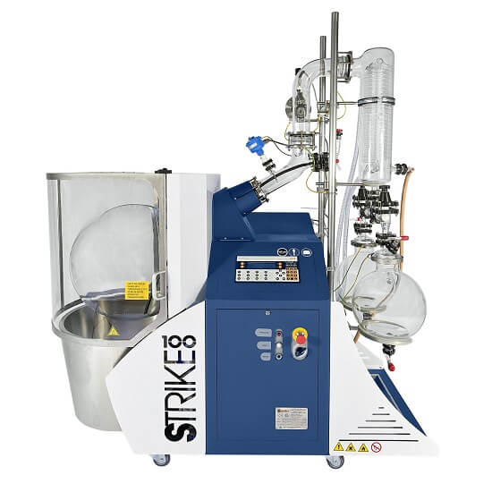 STRIKE100, endüstriyel tesisler için tasarlanmış büyük kapasiteli bir döner buharlaştırıcıdır. Agresif maddelerin arıtılmasına izin veren Borosilikat cam ve PTFE kullanarak tüm proses ihtiyaçlarını karşılar. Ünite, vakum veya atmosfer koşullarında çalışır. Termostatik banyodaki 50 veya 100 lt’lik buharlaştırma balonunun dönmesi, ürünün zorla konveksiyonu ve homojen dağılımını sağlayarak çökelmeyi önler. Ayrıca yüksek buharlaşan değişim yüzeyi sağlar. Sızdırmazlık sistemi, mükemmel vakum sızdırmazlığını ve bakım gerektirmeyen çalışmayı garanti eder.